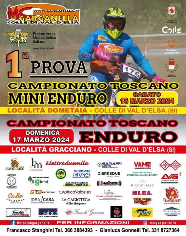 La I° prova del Campionato Toscano di Enduro Parte da Gracciano, Località del comune di Colle di Va d’Elsa e si svolge lungo un tracciato ad anello lungo le colline che circondano la città. Il percorso della gara effettuato come trasferimento ha una lunghezza di circa 50 Km è mediamente facile, ma allo stesso tempo è un percorso che deve essere “guidato”. I tratti con stradoni ed asfalto sono brevissimi. Di contorno il paesaggio che avranno a disposizione chi avrà modo di fermarsi alla prova Cross Test sarà di altissimo livello, grazie alla prossimità con il parco archeologico di Dometaia. Il terreno in caso di pioggia sarà sicuramente insidioso ma non dovrebbero esserci criticità per lo scorrimento della manifestazione. Le aree dedicate ai parcheggi ed al paddock sono un po’ articolate, ma il motoclub Garganella ha preferito che si dovessero sopportare dei disagi e far vivere la gara alla città piuttosto che allontanarsi dal centro e dai servizi. Anche la Gara di Mini enduro si svolgerà Ssbato pomeriggio
