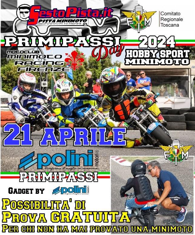 A questo primo evento verranno consegnati i gadget offerti dalla Polini Motori . In collaborazione con il Comitato Regionale Toscano FMI e con la Federazione Motociclistica Italiana sarà possibile per i bambini e bambine che non hanno mai provato una minimoto di farlo GRATUITAMENTE . Tutte le informazioni
