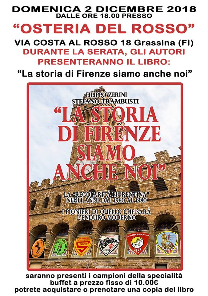 Lo chiamano adesso, enduro, ma per molto è ancora la regolarità, che alla Toscana ha dato tanto. Ed adesso la storia di questo sport, la regolarità, è raccontata attraverso le immagini dei piloti fiorentini che l’hanno praticata dagli anni 60 agli anni 80, ed oltre in una pregevole pubblicazione intitolata “La storia di Firenze siamo anche noi” “Che cosa era la regolarità?” Domanda imbarazzante che vostro figlio o un nipote, potrebbe rivolgervi dopo aver trovato in un cassetto, sotto la tovaglia “buona” del Natale, qualche fotografia dimenticata, in bianco e nero, moto un poco “strane”, vere “accozzaglie homemade” messe assieme dall’amico che aveva un garage ed una moto da trasformare in fuoristrada nei primi anni 60. Beh, le moto da enduro attuali (la regolarità si chiama così oggi), “superspecialistiche” e “nipoti” di quegli anni, sono quanto di meglio la tecnologia ci può dare, i pionieri della regolarità avevano a disposizione le moto stradali, addirittura si correva con le Lambrette (!), moto a cui timidamente si montava una forcella con una escursione più lunga, due copertoni con un poco di tassello, nastro isolante, fil di ferro, chiave per candele e pronti, via! Tutti ad affrontare sentieri, polvere o fango, nei campi e nei boschi. La storia di uno sport, la regolarità, raccontato attraverso le immagini dei piloti fiorentini, i quali hanno frugato nei loro cassetti in cerca di fotografie della loro gioventù, oggi ognuno di loro ha una propria attività, sono avvocati, manager affermati, qualcuno è rimasto nell’ambiente, vendendo motociclette in bellissimi saloni, altri hanno scelto strade diverse, ma nel cuore resta quella gioventù, la libertà, la spensieratezza degli anni passati con la moto nel fango e nella polvere, un vero amarcord di uno sport che ha fatto parte di Firenze e della sua storia.” Il libro sarà presentato agli appassionati, domenica 2 dicembre 2018 dalle 18.00 in poi, presso l’Osteria del Rosso, via Costa al Rosso 18 Grassina (FI), durante una serata con i Campioni fiorentini della specialità, vi aspettiamo.