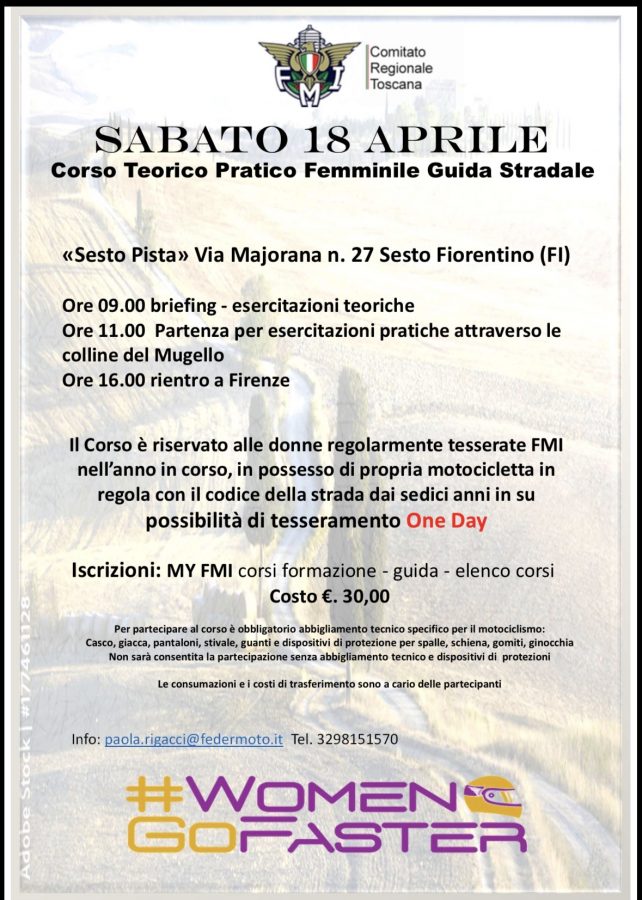 Il Comitato Regionale Toscana della Federazione Motociclistica Italiana è lieto di annunciare lo svolgimento del Corso Teorico Pratico Femminile di Guida Stradale, in programma per sabato 18 aprile 2026 presso l’impianto «Sesto Pista», Via Majorana n. 27, Sesto Fiorentino (FI).