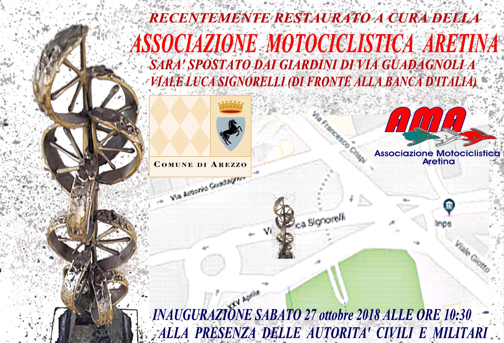 Sabato 27 ottobre alle ore 10,30 si terrà ad Arezzo l’ inaugurazione del Monumento Caduti della Strada, posto in via Luca Signorelli e restaurato recentemente dall’ Associazione Motociclistica Aretina.